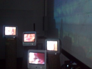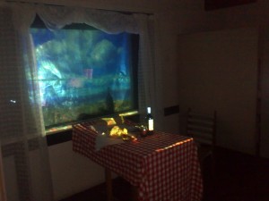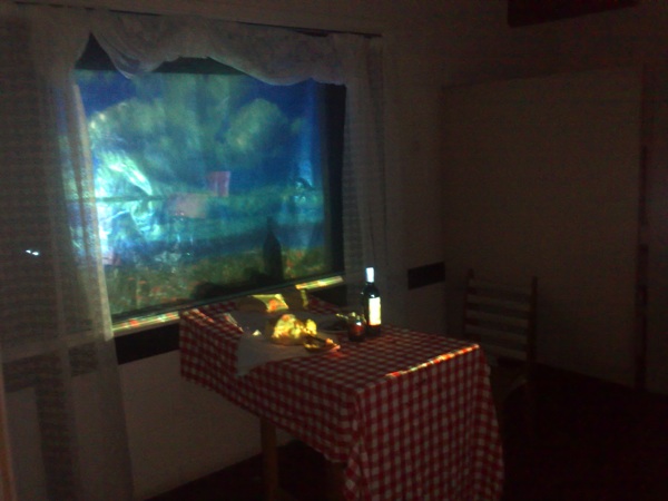The projection reflected of the glass to make a double image with nice silhouettes of the items on the table. All in all it was quite an interesting space to be in. (The dodgy pics from my mobile don’t do it justice)